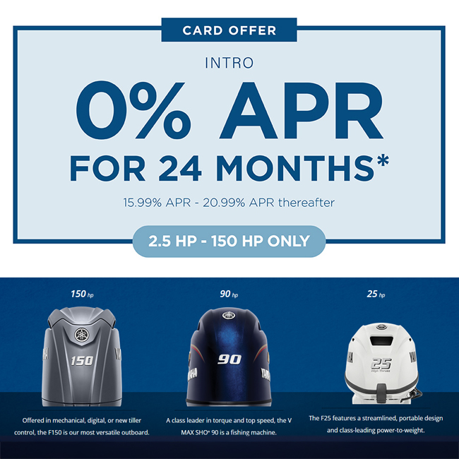Power your next season on the water with the Yamaha Outboards Proven Power Finance Offer, designed to make repowering easier than ever. For a limited time, qualified buyers can take advantage of 0% introductory APR for 24 months, giving you the flexibility to upgrade your engine now and pay over time. It’s the perfect opportunity to replace an aging motor with Yamaha’s trusted performance, fuel efficiency, and reliability, so you can get back to enjoying every moment on the water with confidence.